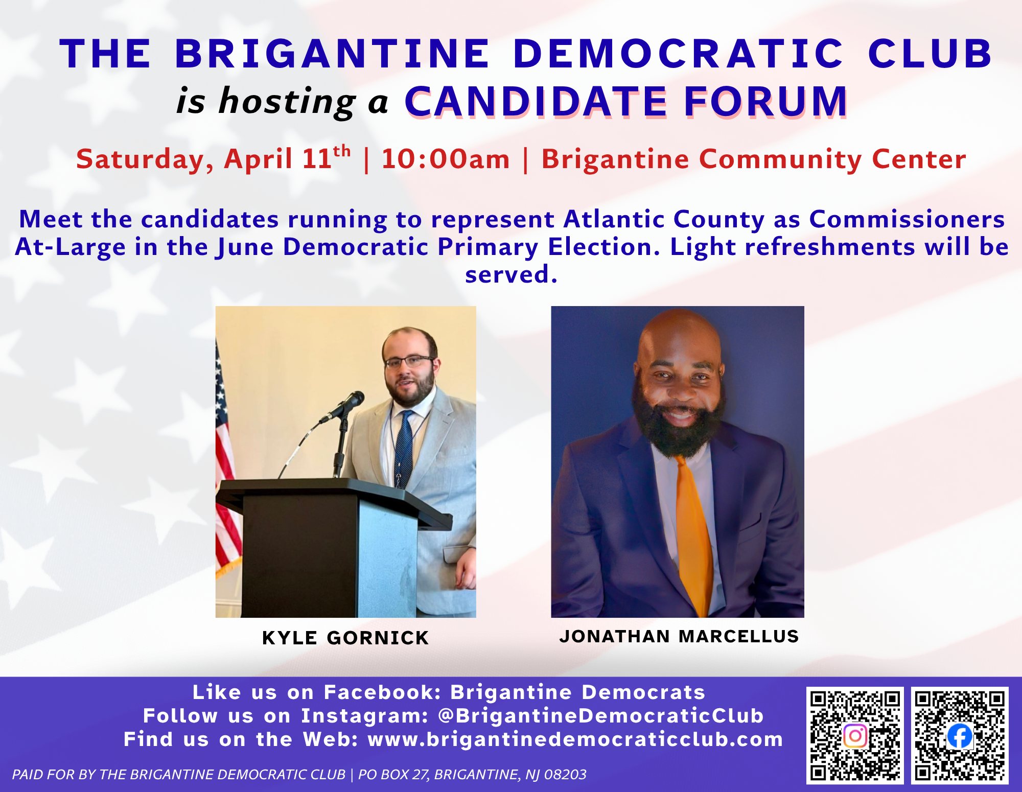 Atlantic County Commissioner-at-Large candidates Kyle Gornick and Jonathan Marcellus spoke at the Brigantine Democratic Club meeting on Saturday, April 11th, sharing their vision and engaging in a thoughtful discussion with members.